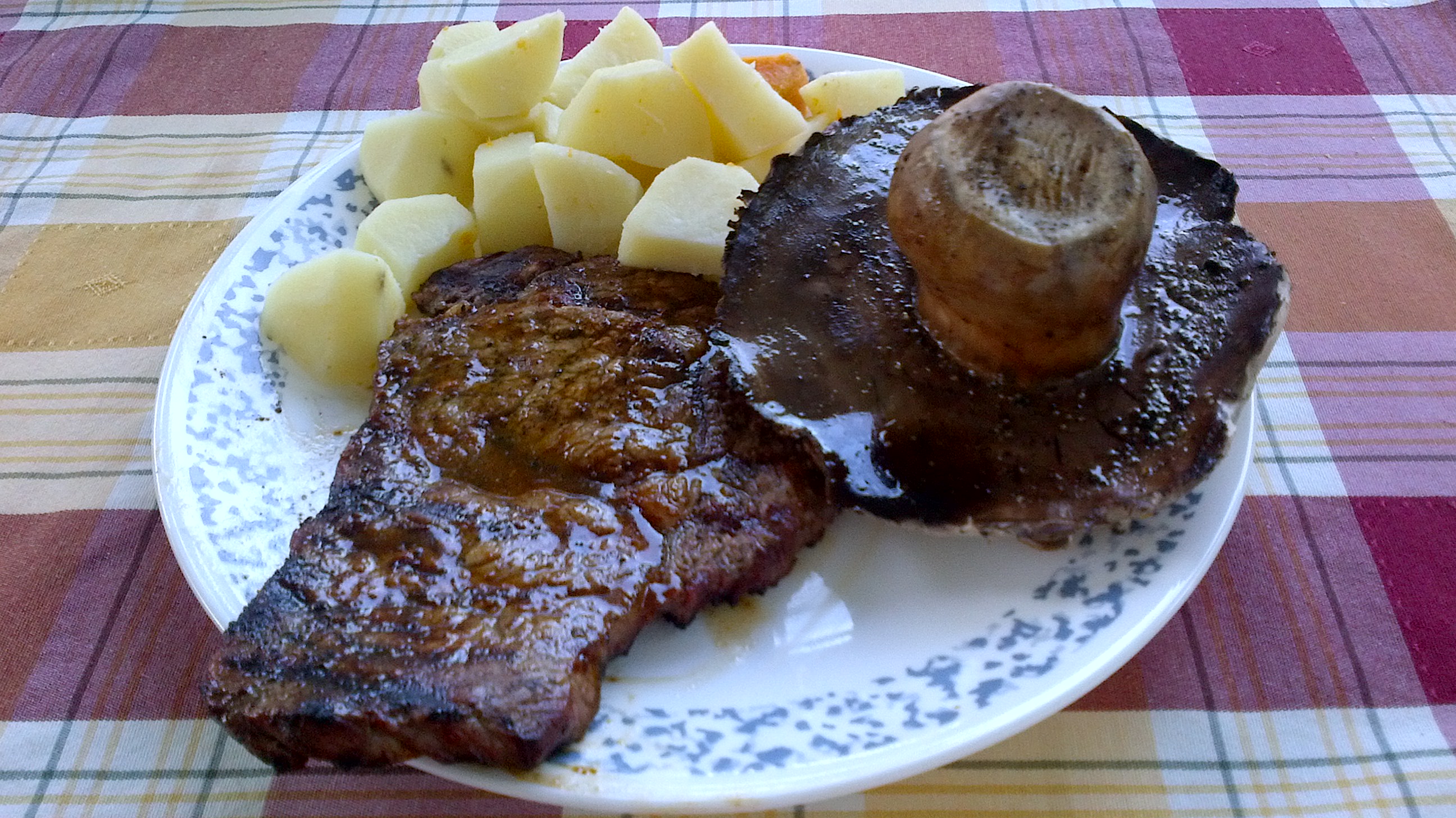 Steak: salt and pepper to taste, garlic powder and Montreal steak spice, cooked on the BBQ as you wish (mine is medium well)