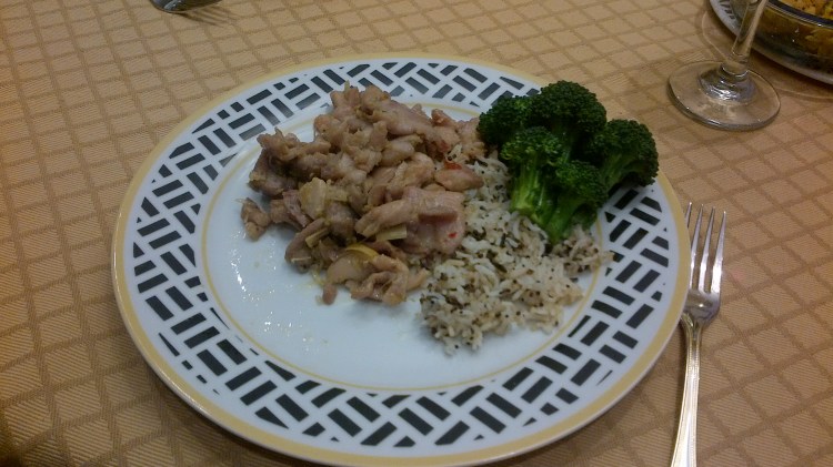3. Heat a wok over medium-high heat and add the peanut oil, swirling to coat the entire surface. Heat the oil for 1 minute and add the marinated chicken mixture. Stir fry for 15 minutes (the chicken and sauce will thicken and become caramelized). Remove from heat and serve with cold cucumber slices, lettuce and jasmine rice (I had mixed rice with broccoli)