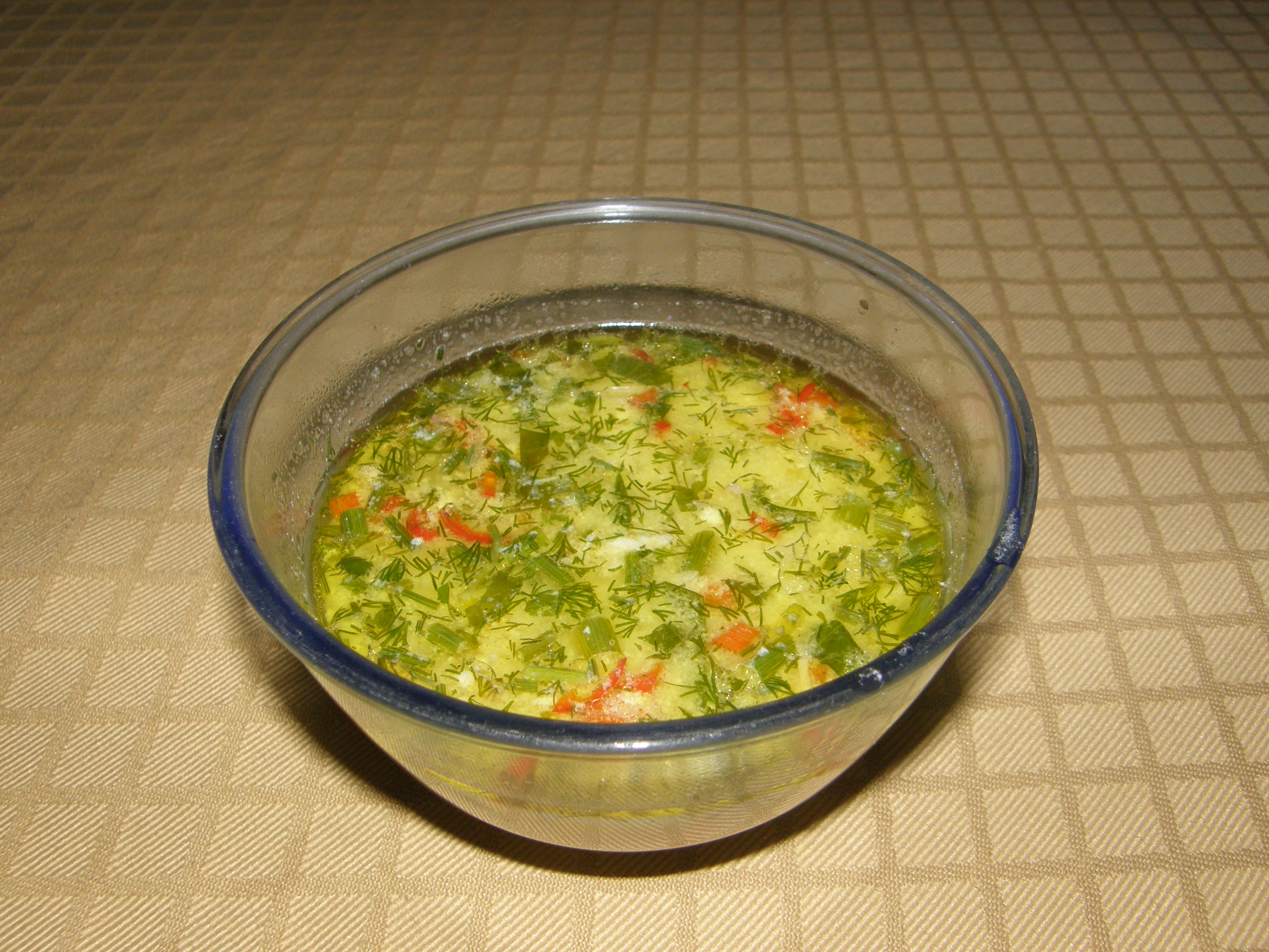 The soup is served with one minced garlic clove, one tablespoon of sour cream and hot peppers or hot sauce.