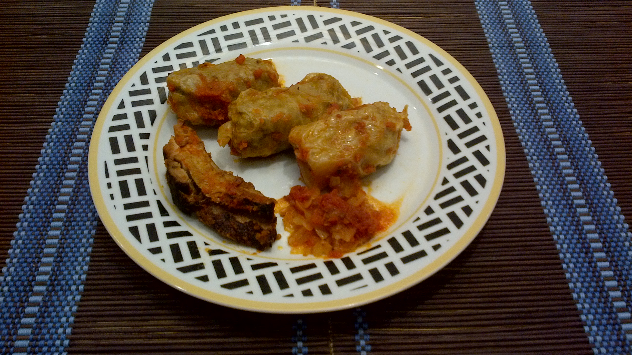 In a large mixing bowl combine onion, tomato paste, rice , zucchini, parsley and dill (finely chopped) and pepper. Add the meat to the mixture blending thoroughly until well incorporated by adding the water to the combination gradually. If you prefer the rolls not so sour, then leave the leafs in cold water for few hours. To roll the cabbage: place a cabbage leaf in front of you, rib face to you. Place a tablespoon of filling in the centre of the leaf. Roll up the cabbage leaf, tucking both ends. Using a Dutch oven, preheat oven to 350 degrees F, layer the remaining cabbage leafs at the bottom of the dish and organize the rolls tightly in top of each other. Top with the smoked ribs. Add tomato sauce made from fresh plum tomato. Cover and bake for 3-4 hours or until rice is cooked through and the cabbage is tender.