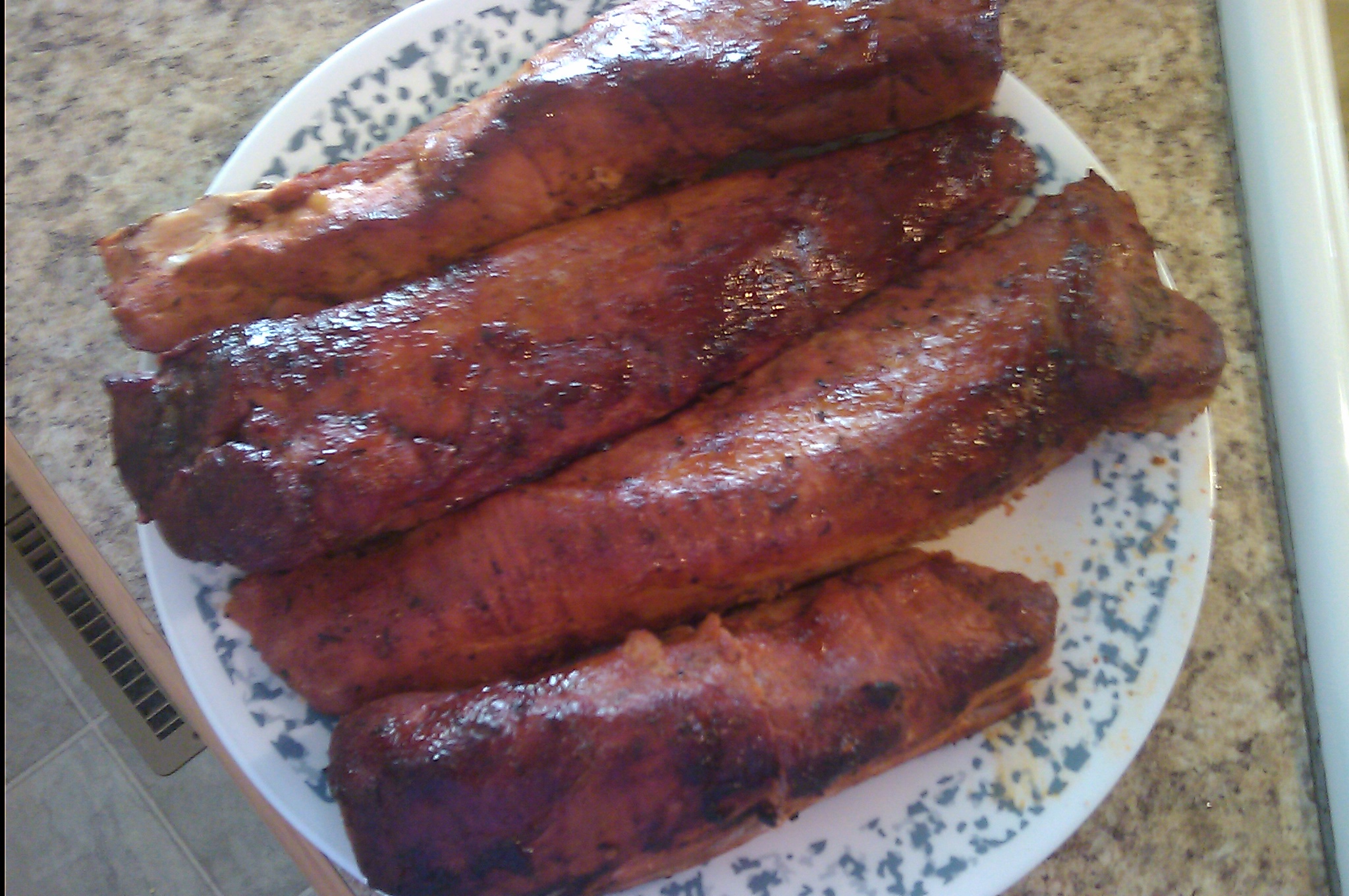 Very easy recipe, just use fresh pork tenderloin, salt&pepper to taste, garlic powder and some Sriracha sauce for spiciness. Smoke them on very low temperature (mine was on 120 C) for few hours and enjoy.