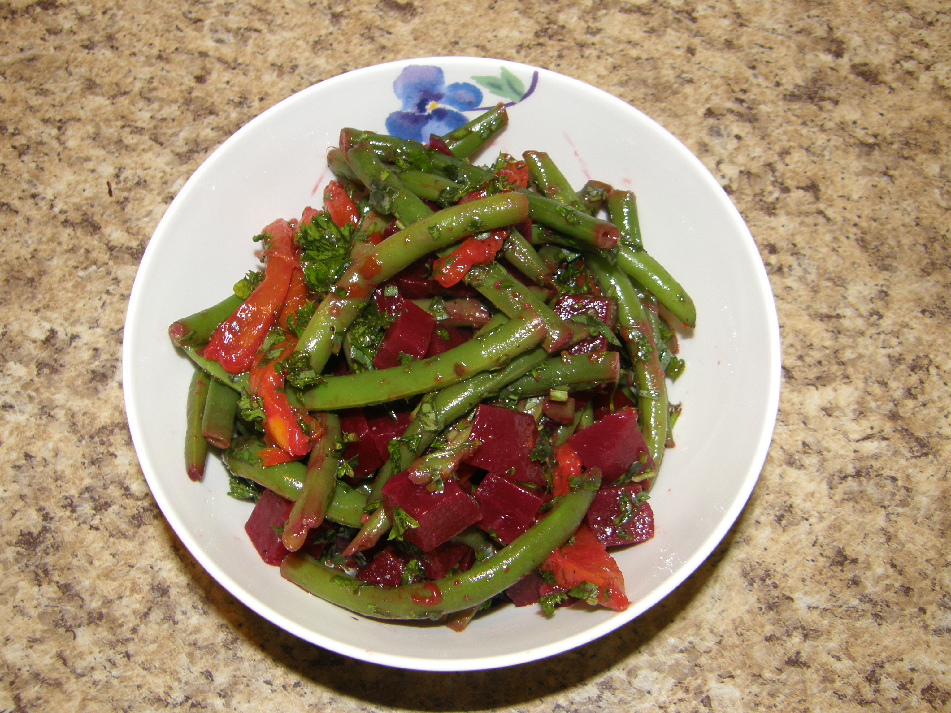 In a saucepan, boil water and then add the beans and steam for 5 minutes and then cut them in half. In the same water, add the beets and boil until cooked through for approx. 40min and cut them in small cubs. Leave both to cool down and start grilling the peppers. I grill them for about 35-40 min on medium heat until tender when pierced and the skin peels off. Cut them in thin strips and add to the beets and beans. In a bid bowl, mixed everything good and add balsamic vinaigrette, lemon juice, salt, pepper and all the fresh herbs.